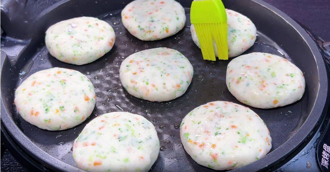 12、电饼铛提前预热,倒入少许的食用油,给它涂抹均匀,油热后,依次放入山药香蕉饼,并在表面刷上一层食用油,锁住水分,盖上盖子,开上下火烙1分钟,把饼烙至定型。