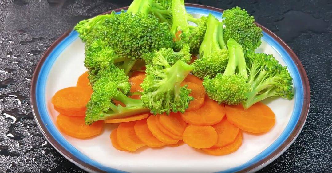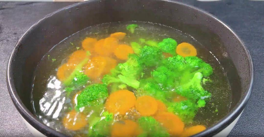 4、锅中水提前烧开,加入一勺食盐,一勺食用油,用铲子搅拌一下,倒入西兰花和胡萝卜片,大火烧开后,再煮1分钟,最后用漏勺控水捞出,迅速放入凉水中过凉。