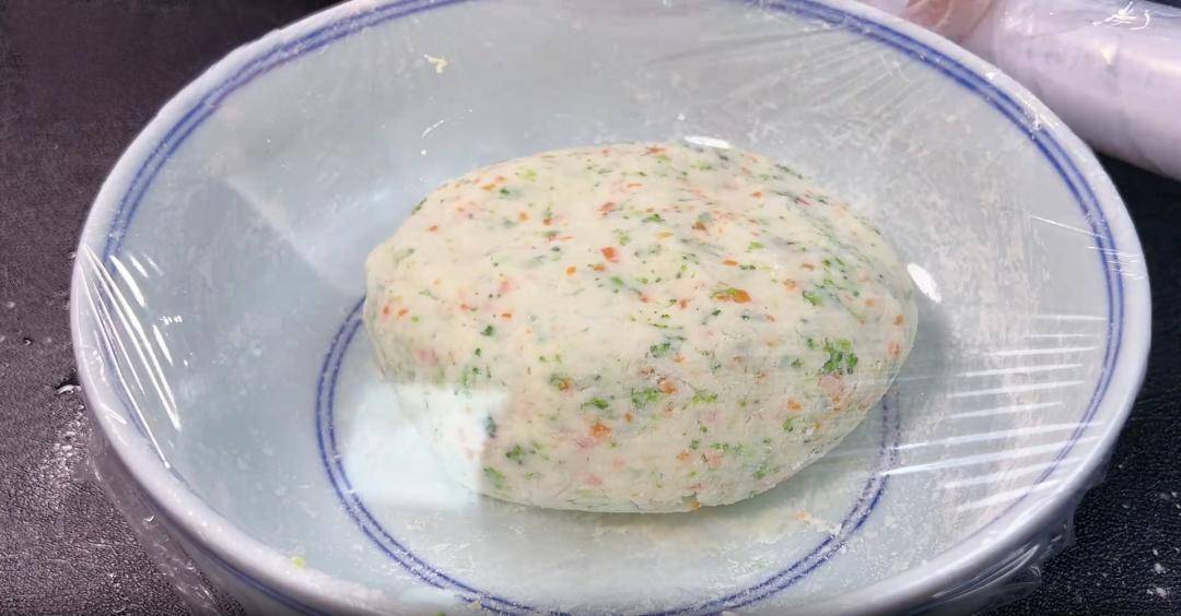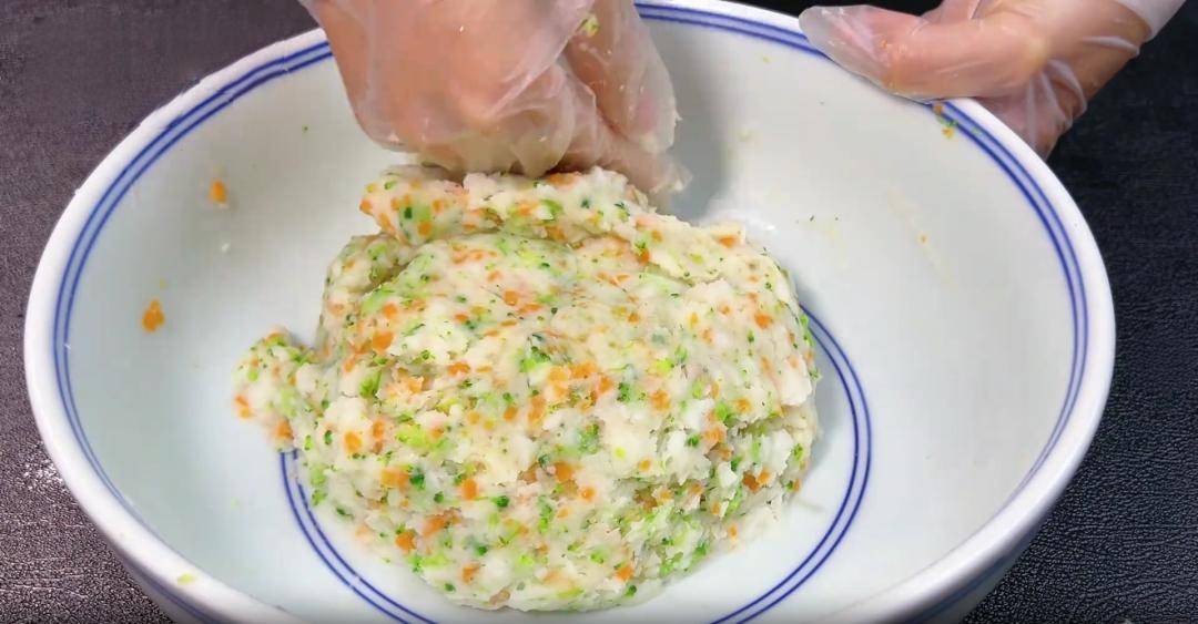 6、将西兰花和胡萝卜控水捞出,前者用刀切碎,后者切成小丁,也是切得越碎越好,切好后,放入大碗中,再戴上一次性手套,给它抓拌均匀,让胡萝卜和西兰花完全融入山药泥里。