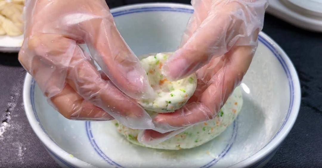 9、戴上一次性手套,揪起一小把糯米面团,用手捏得紧实一些,再给它搓成和乒乓球一样大小的圆球,然后用拇指在底部,给它攥出一个窝窝,给它做成一个鸟巢的形状。