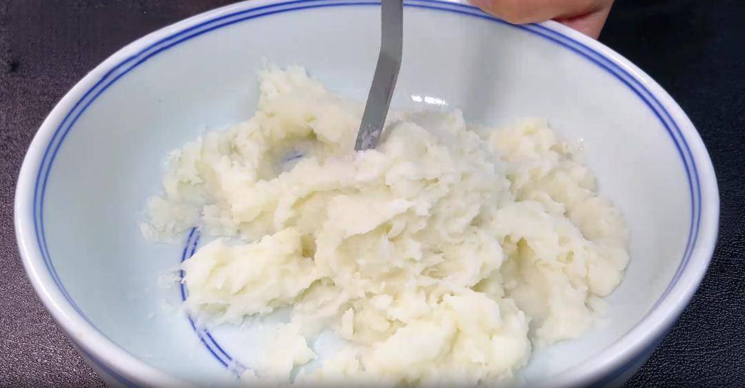 5、取出蒸熟的山药,将它倒入大碗中,再加入10克白糖,喜欢吃甜的,可以多放一些,再给它压成山药泥,压得越细腻越好,放一旁备用。
