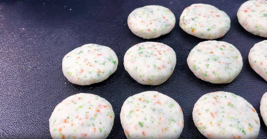 11、紧接着,将它放在手心搓得圆润一些,再用手按成一个小饼的形状,稍微整理平整厚,一个山药香蕉饼就做好了,全部做好后,依次放在案板上。
