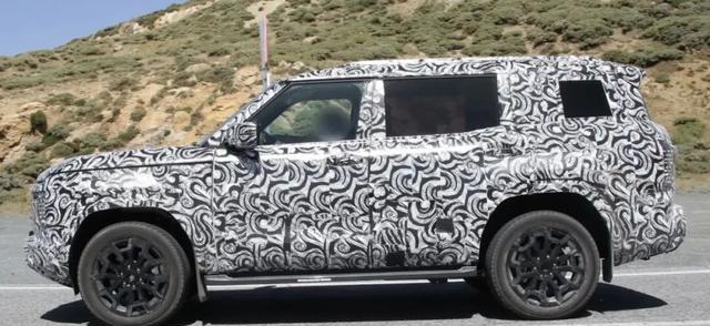 车身侧面线条平直有力,悬浮式车顶设计和熏黑处理的A/B/C柱营造出独特的视觉效果。测试谍照显示,新车将保留传统门把手设计,而大尺寸轮毂和较高的离地间隙则保证了其通过性。车尾部分,渲染图展示了两种可能的设计方向,其中贯穿式尾灯版本更符合当下消费者的审美偏好。